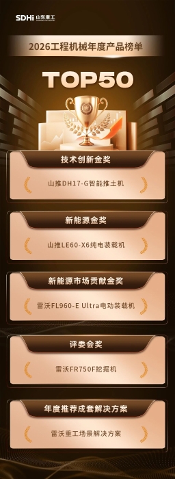 3月27日,“2026工程机械年度产品TOP50”榜单发布活动在北京举行,山东重工旗下山推、雷沃重工两大品牌的五款产品及成套解决方案强势入选,充分彰显集团在工程机械领域的硬核创新实力与全场景解决方案能力。